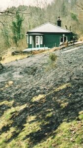 A headless chicken ran indoors to fill watering cans and buckets to douse the fire front threatening to lick at the cottage’s timber cladding. As those flames hissed and died, others leapt up the hill behind us, blackening and scarring oaks, eventually halted by fireproof green pillows of damp moss. Where flames met short green grass, they sputtered out. Water vanquished any smouldering pockets.