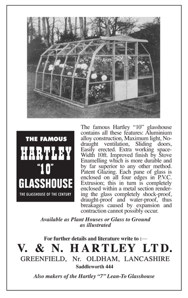 ‘safeboil’ which prevented the boiling over of milk. His crowning achievement however came when he created a solely aluminium and glass greenhouse, marking a huge step forward from its wood and wrought iron Victorian counterparts. In using aluminium, Vincent and Norman Hartley were able to create a greenhouse which both maximised light and celebrated design. They were the first to employ aluminium purlins and joints to create spacious, elegant interiors free from internal bracing, presenting an optimum area for natural light. Their aim was to create structures which were beautiful, clean, uncluttered and practical, principles which are still clearly evident in every greenhouse built by the company today.