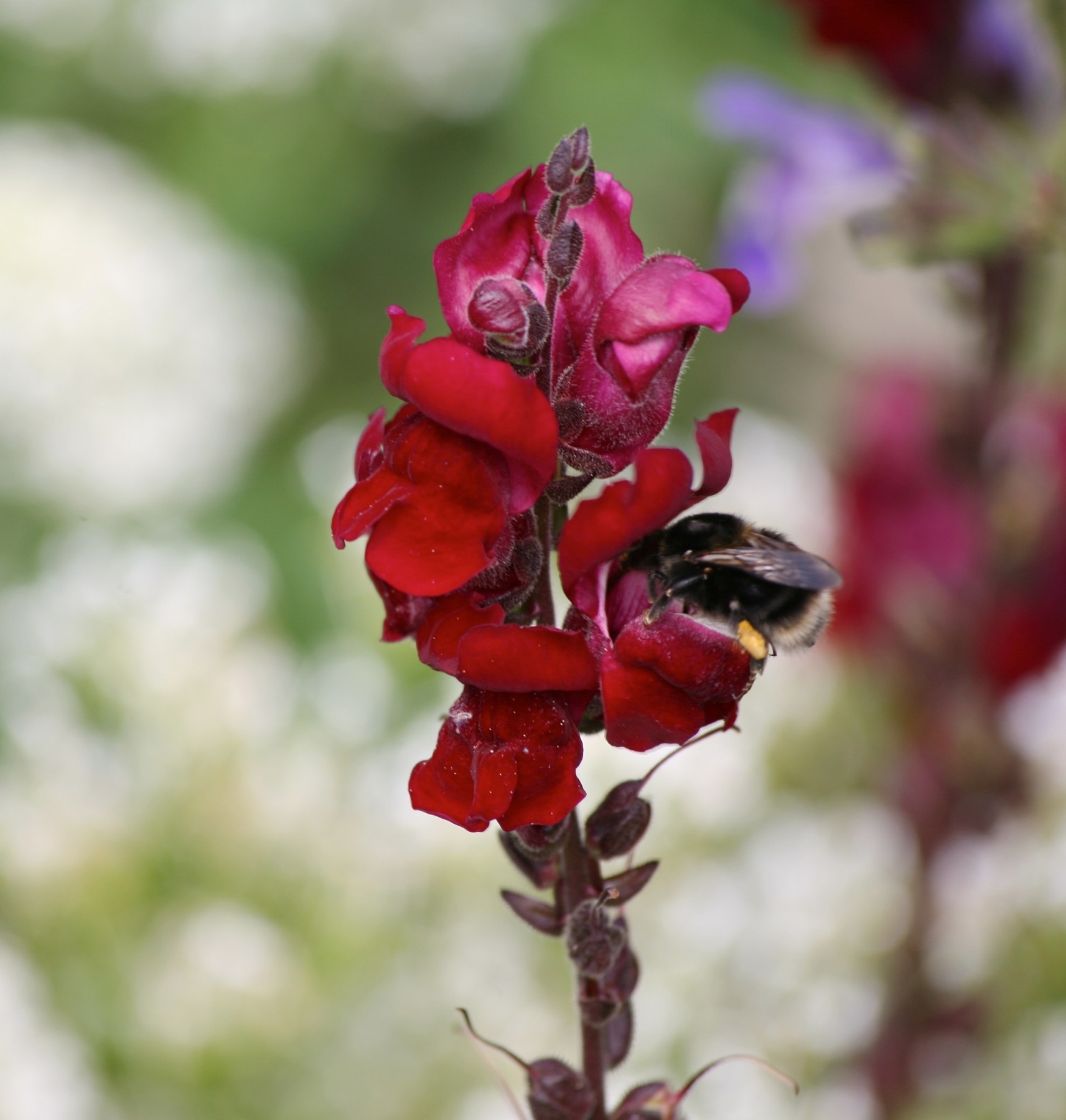 Honeybees are very consistent because the waggle dance indicates where they have to go, so if they’re pollinating apple blossom the workers only visit apple trees. The bumblebee is a random browser and you can watch them going from flower to flower. They have a unique ability to buzz pollinate as well: they literally shake the pollen from the anthers. They’re quite large and heavy and able to access lots of flowers honeybees fail with. They can lever open snapdragons for instance. They are the main pollinators of broad beans and the set is always improved when bumblebees visit the flowers.