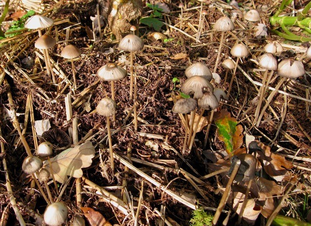 I knew that the shredded material (aka chipped branch wood) would add nutrients to my previously unimproved soil, and that as it decayed it would boost myriad soil life, both obvious and unseen; increased earthworm activity has been unmissable when I’ve gently rummaged around in the top few inches of the soil. But it’s become clear that there’s much more going on. The woody chips started out green and sappy; after a month or so, those mixed into the soil surface had darkened and turned noticeably ‘mouldy’, while those lying dry on the surface showed little change. I’ve gleaned enough from a gardening lifetime to realise that the mouldy wood chips were being broken down by fungi carried in the leaf mould I used as an inoculant, as well as those already present in the soil. Up close, I could see that the pale coating of mycelium was not just encasing the chips, but that its single cell-thick hyphae were also growing under the bark and down between the cracks in the wood. They also had a divine ‘mushroomy’ smell. To my mind, it was just nature getting on with the job of rotting the woody chips down into soil-improving humus. But then came the toadstools.