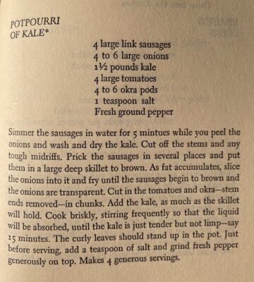 Last year, it being the fallow year, even the things I did grow were a source of pain: I swore I’d never grow another tomato, zucchini, mixed salad greens, peas, beans, peppers or eggplant. But here I am, perusing the plant lists, encouraged by a visit to my library’s annual book sale where I picked up a copy of Gardening for Gourmets: Good Eating from a Small Garden Plot — I am a sucker for old gardening books, as you know. Published in 1957, authored by Ruth A. Matson, I was hooked by the first chapter, ‘The Armchair Gardener’, and entertained by the recipe for ‘Potpourri of Kale’, a slumgullion of sausage, onion, tomatoes, okra and that most ubiquitous of greens, kale. It tickled me no end to learn that slumgullion was coined by California miners who gave that moniker to the muddy sludge left behind after panning for gold. Seemed about right to me for a recipe including the dreaded kale. But I digress.