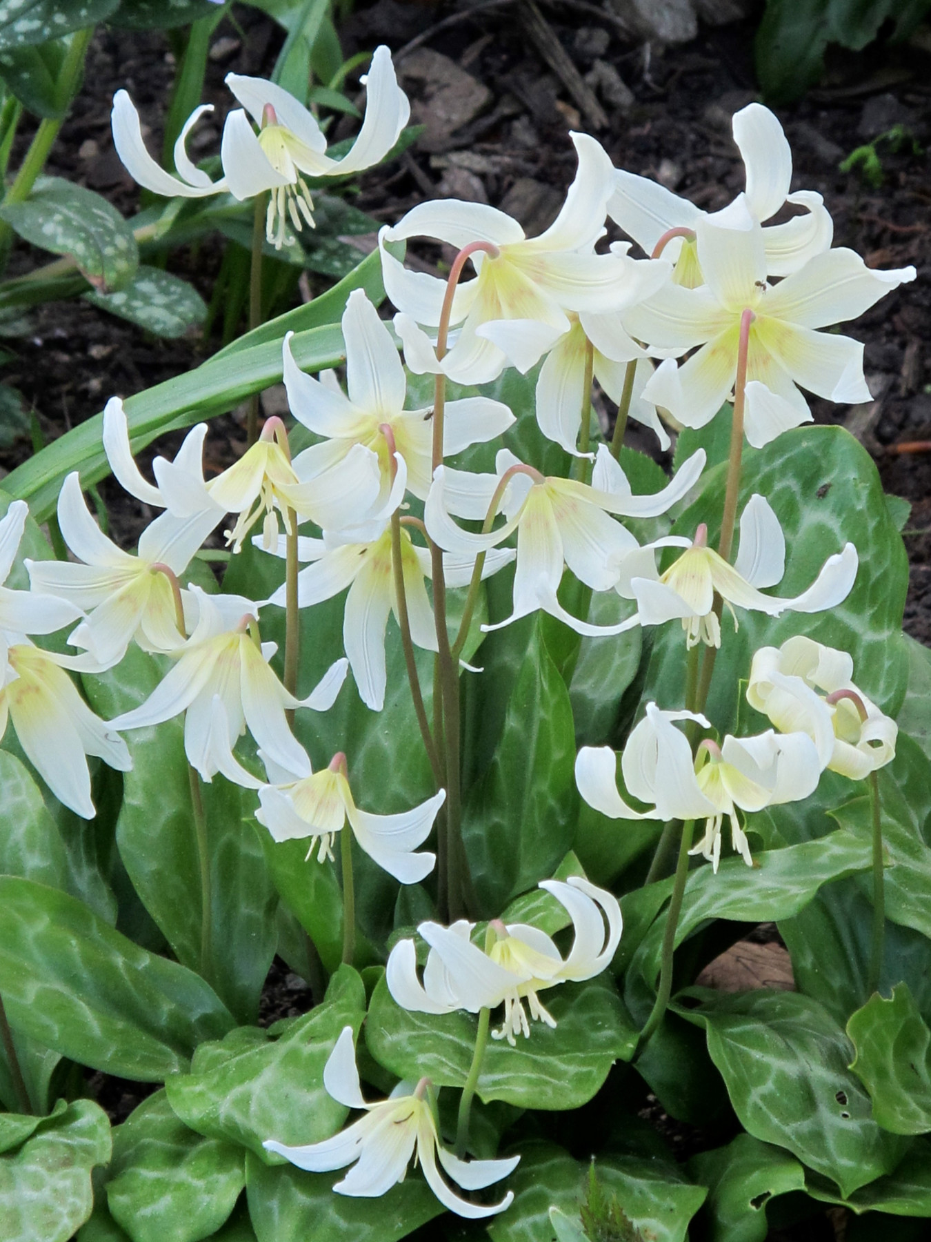 One common name for erythroniums is trout lily, because many have attractively mottled foliage rather similar to fish scales. This marked foliage emerges about four weeks before the flowers and adds much to a woodland patch. The bulbs are brittle and they do not have a protective skin so they scan nap easily if handled roughly. Take care when planting in autumn and when splitting up clumps after the flowers fade. Water them well before lifting and place your clump onto newspaper ,or a tarpaulin. Gently tease the bulbs apart and then, very carefully, replant single bulbs into friable soil that has been dug over really well. Adding garden compost or John Innes no 3 will help. Water the ground if it’s dry when replanting. It’s a time-consuming job that must be done carefully and I try to divide every third year to create swathes.