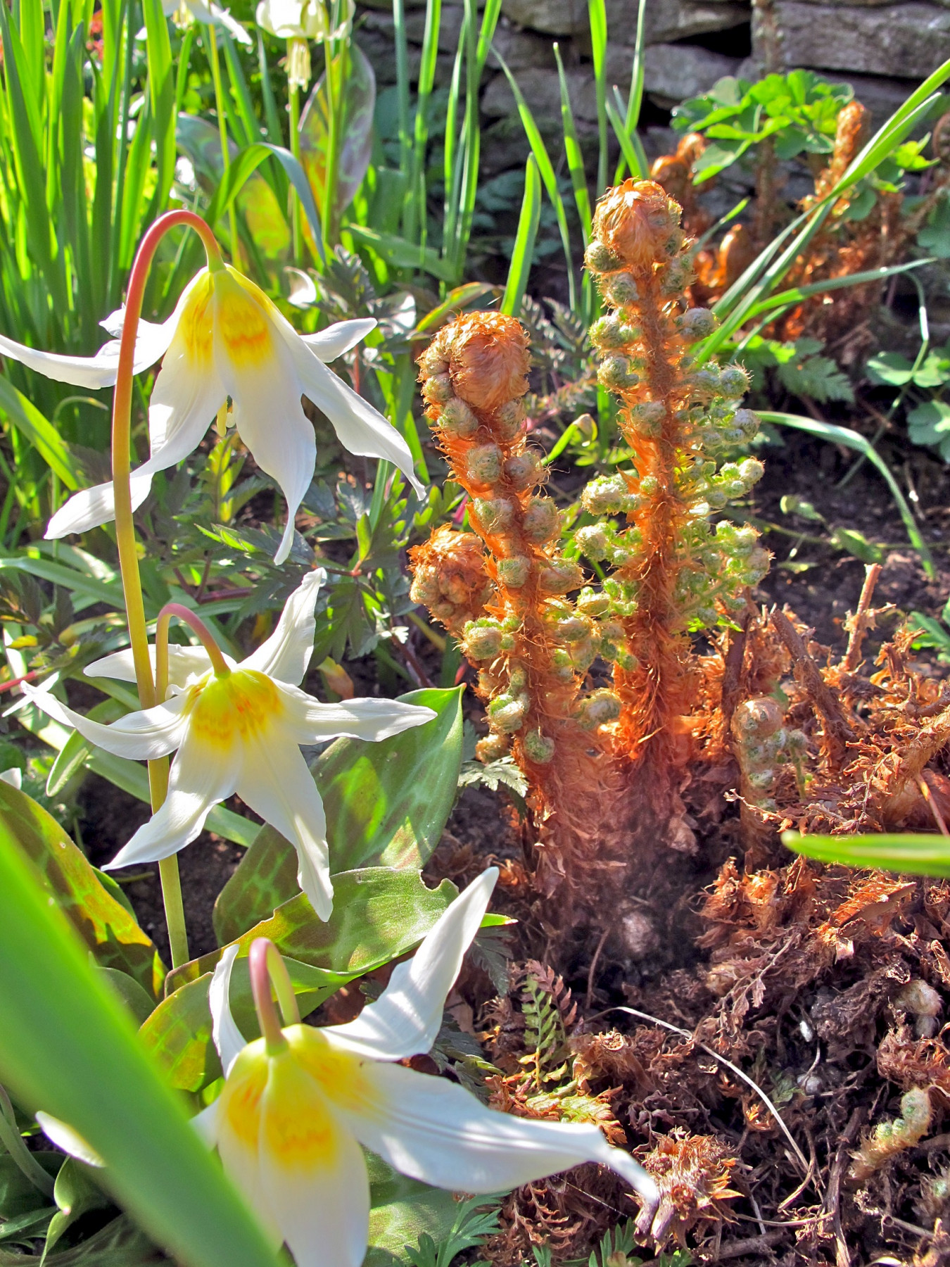 Erythroniums are snow-melt plants in the wild, so they love a damp, cool spring. Conversely they can look miserably shrivelled in dry springs when temperatures rise too high, far too quickly. Consequently I find myself praying for a late, cool spring because then my erythronium flowers will be magnificent and long lasting. ‘White Beauty’ is a selected form of Erythronium californicum, a species found only in California in yellow pine forests on the chaparral, or on woodland edges. In my garden they often flower just as the polystichums, those rusty-bristled hardy ferns, unfurl their fronds. In cool springs, the two are freeze-framed and barely move. If it’s precociously warm the fronds, which look as though they’ve been crocheted, can unfurl in a day.