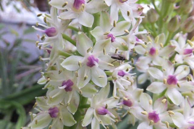 Eucomis species are mostly South African in origin and E. comosa comes from the hill lands of Natal making it the hardiest of a tender genus. The common name is only vaguely appropriate for Eucomis does not much resemble an actual pineapple flower, nor much resembles a pineapple, however gets the name for the same reason. Both of these were introduced in the same period and were so called as they both looked somewhat like pine cones, the nearest analogy of the time. (Pine cones were a popular motif often surmounting pew ends in churches or stood atop pillars, particularly by grand entrances.)