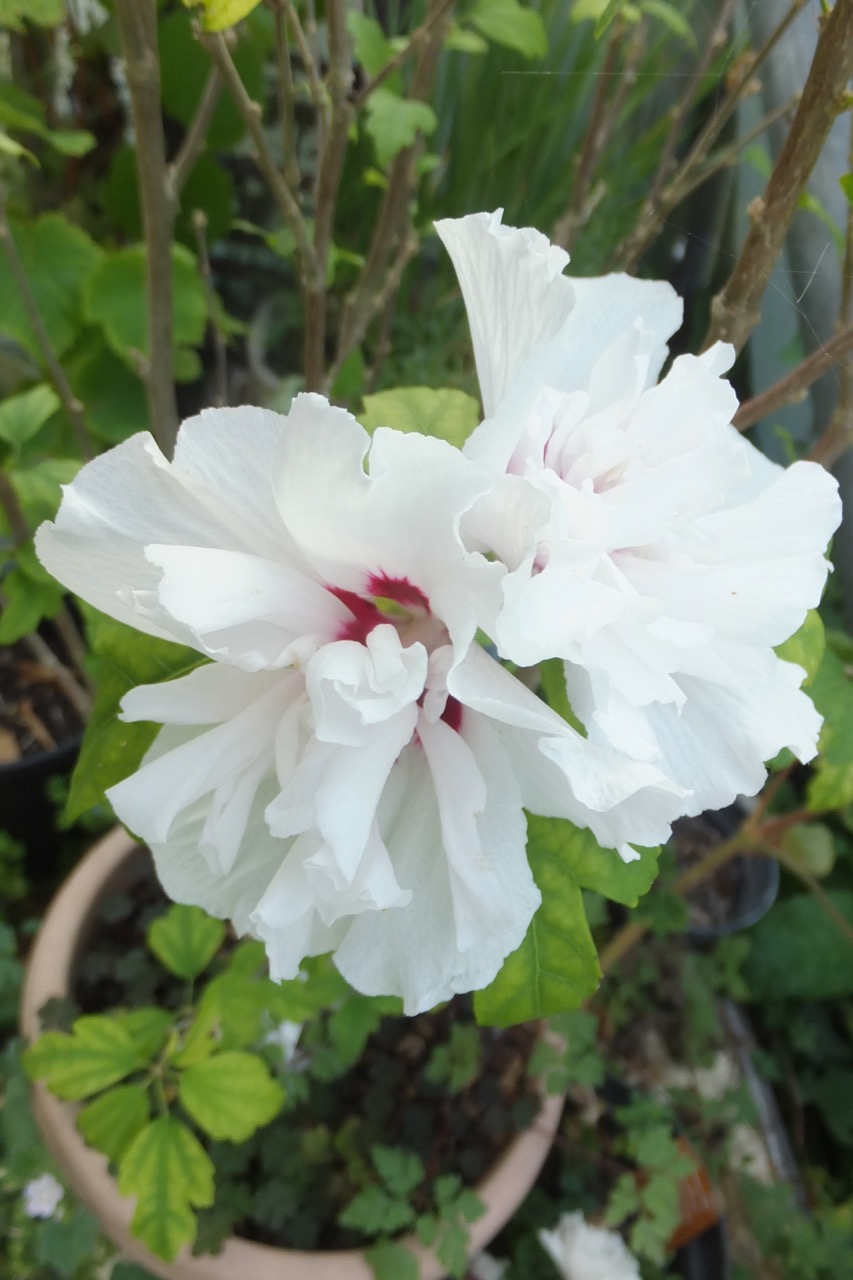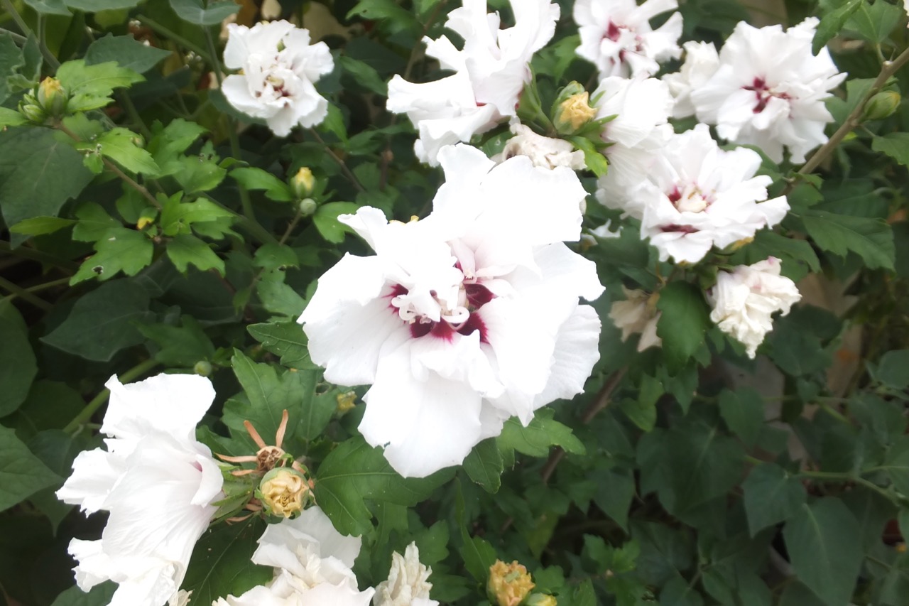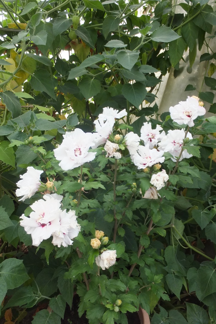 And this same useful attribute belongs to varieties of Hibiscus syriacus (I wrote about other species of Hibiscus in October 2011). Modern breeding has now given us such as the exquisite China Chiffon. A stunning display of enduring Gardenia like blooms on an attractive bush, blooms which are also superb when cut for buttonholes.