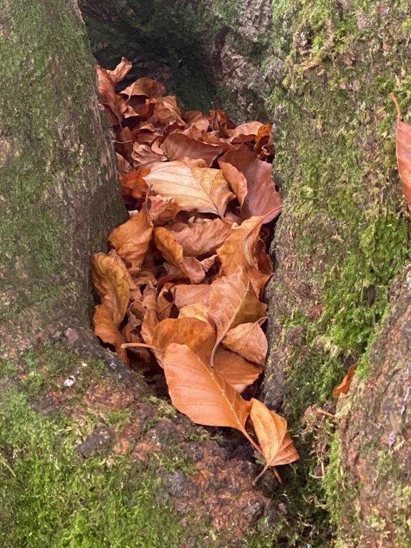 Leaves blow into all sorts of nooks and crannies where they provide safe overwinter sites for bumblebees, and other precious creatures. If the hollow holds water it creates a natural hoverfly lagoon, the perfect breeding site for hoverflies which are both precious pollinators and free ‘pest’ control for the garden. Leave that puddle of rotting leaves, it’s a haven for minibeasts and much, much more.