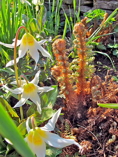Joan also had good numbers of Dryopteris , Polypodium, Athyrium and Phyllitis. She was interested in setting up a national collection of Blechnum, although it came to nothing. She grew her ferns and erythroniums on small terraces creating pockets of soil contained by peat blocks. These areas were kept moss-free. She was proud of the fact that the peat, which came from the Somerset Levels, didn’t cause any habitat destruction. The blocks decay very slowly and soon become moss-covered so it looks very natural.