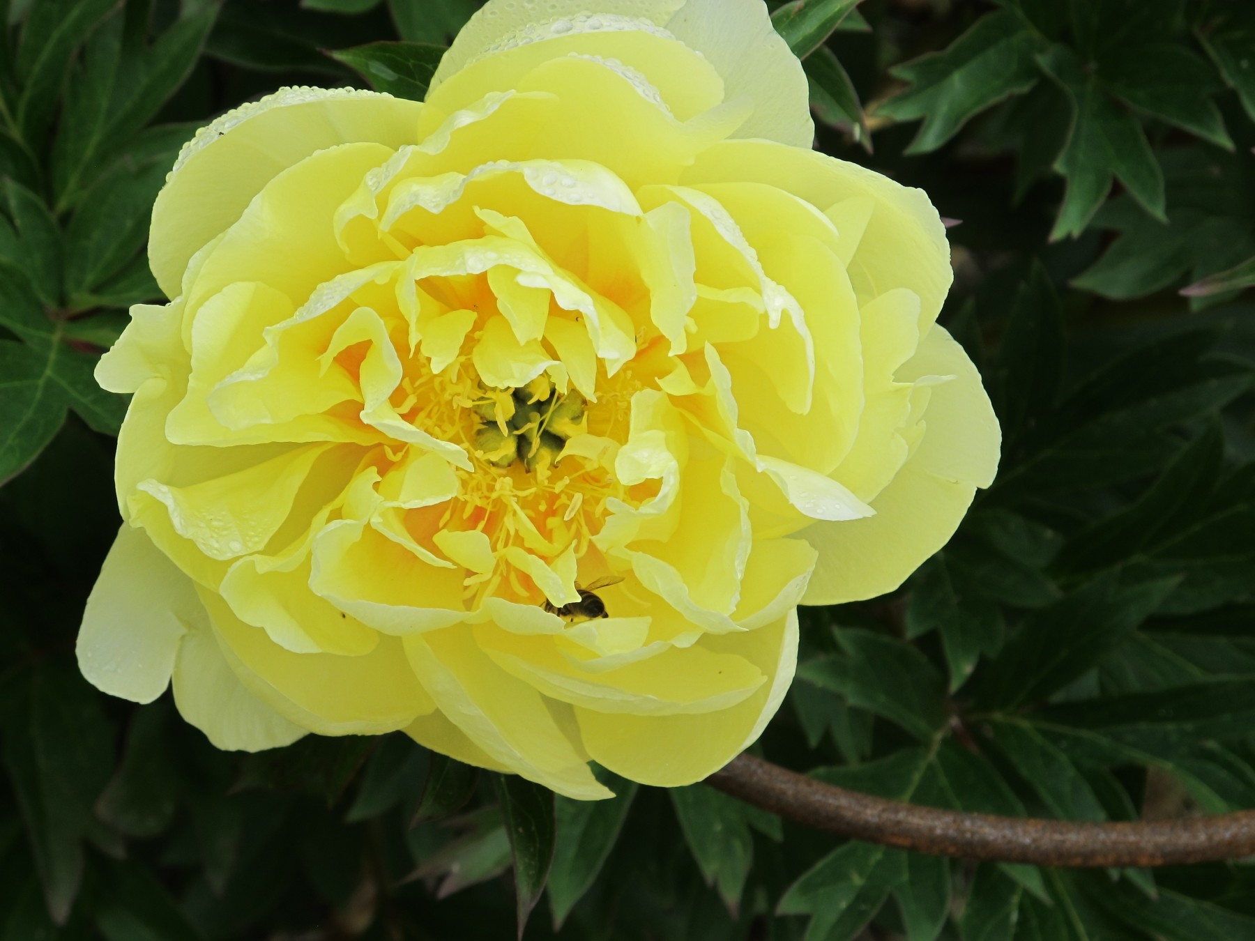 I’m definitely for plants blending in, not jumping out at me, and at the moment I’m wrestling with an intersectional hybrid peony called ‘Bartzella’. It has enormous light-yellow flowers, more tea-plate than saucer in size, on a low plant that reaches between 2 and 3 feet in height. The stems are woody and the light-green foliage is more tree peony than herbaceous peony.