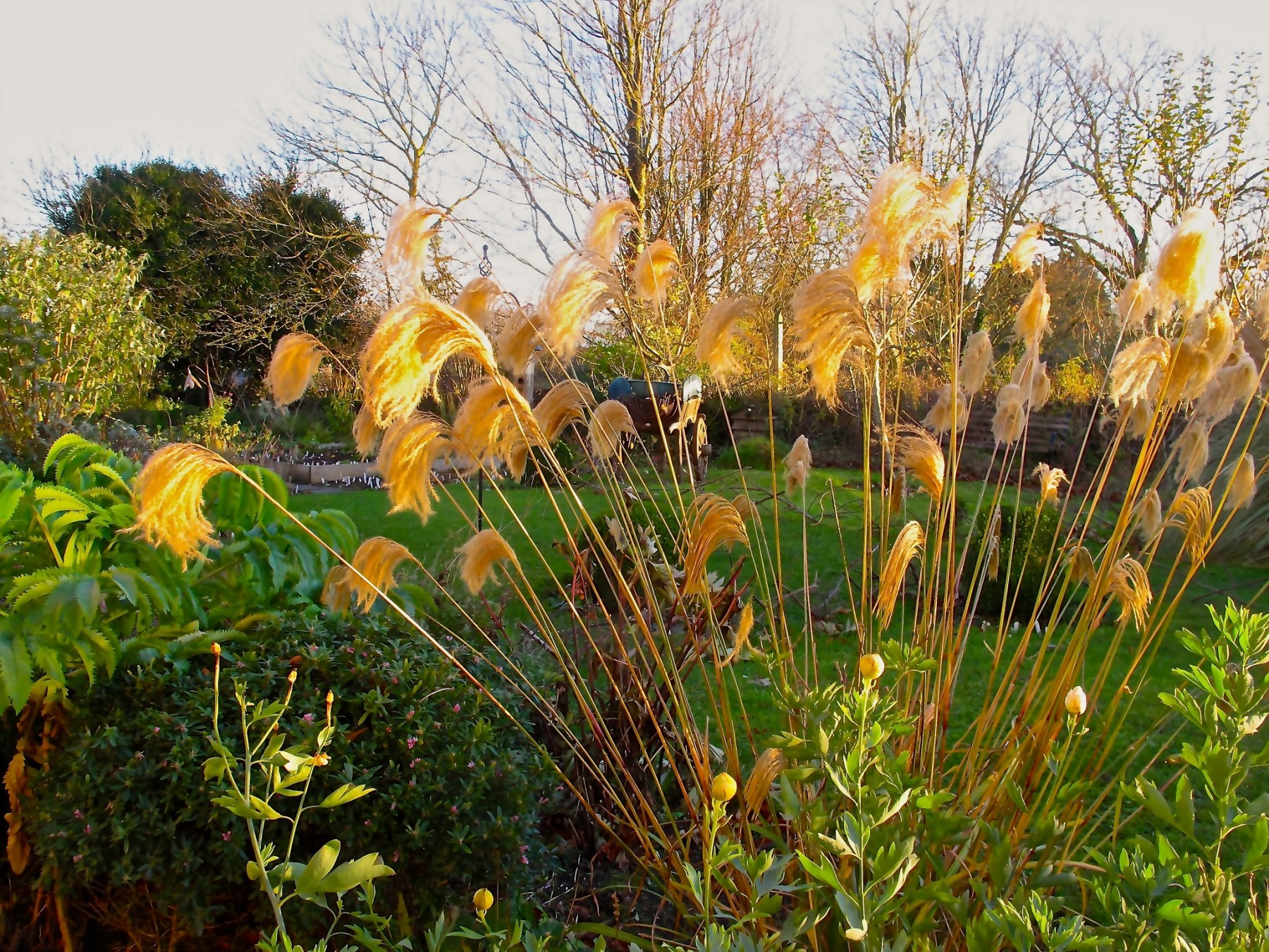At the back end of the year the plants that draw my eye at Spring Cottage, more than any other, are the grasses because low winter sunlight shows them off really well once most of the garden has faded. Some form beaded, gossamer veils and others are like strong punctation marks. Others swirl and curl, like fine fibre-optic lamps, and some just shimmy and shake.