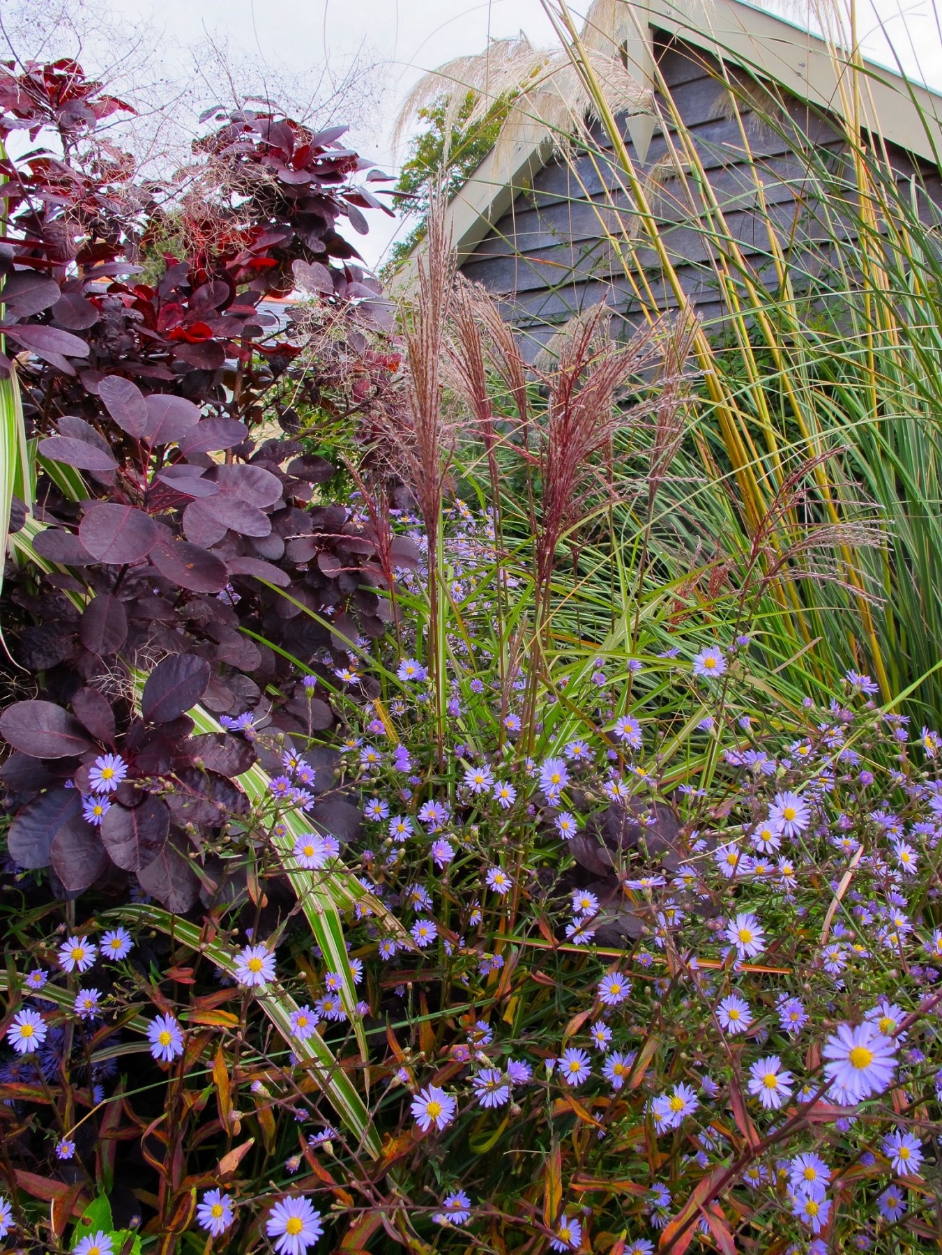 There’s also another grass, Molinia caerulea subsp. arundinacea ‘Karl Foerster and this turns a wonderful shade of gold in early September from tip to toe. Here it grows near the finely beaded ‘Transparent’. These tall molinias, the ones labelled arundinacea or arundo-like, tend to collapse in early December and have to be cut down. However they do flower from July onwards so they’re still good value.