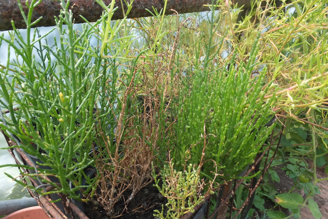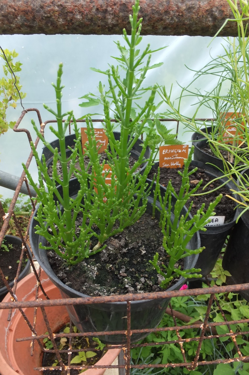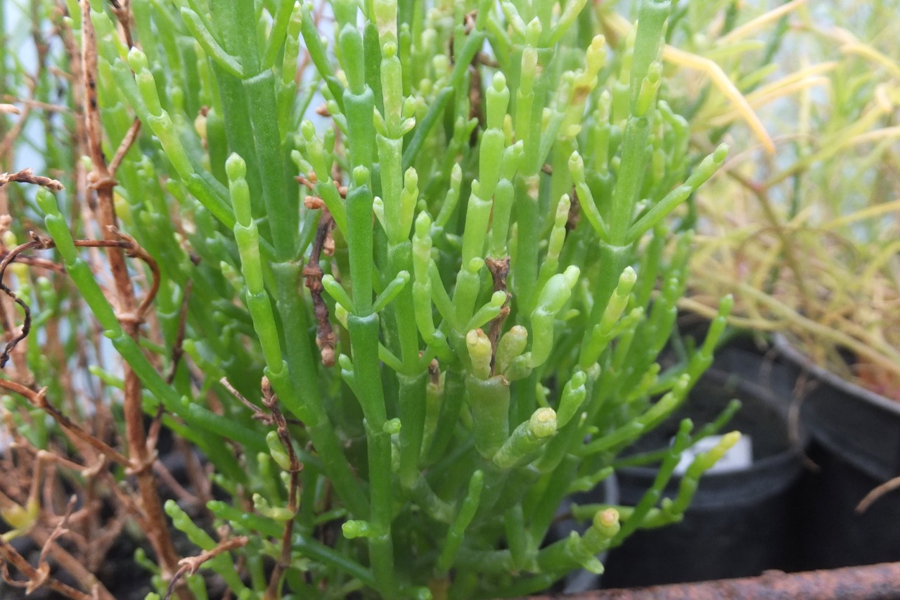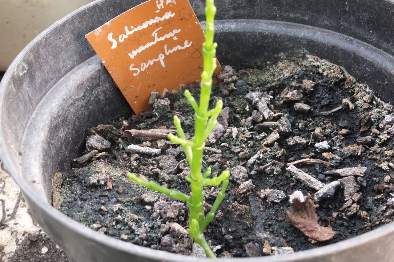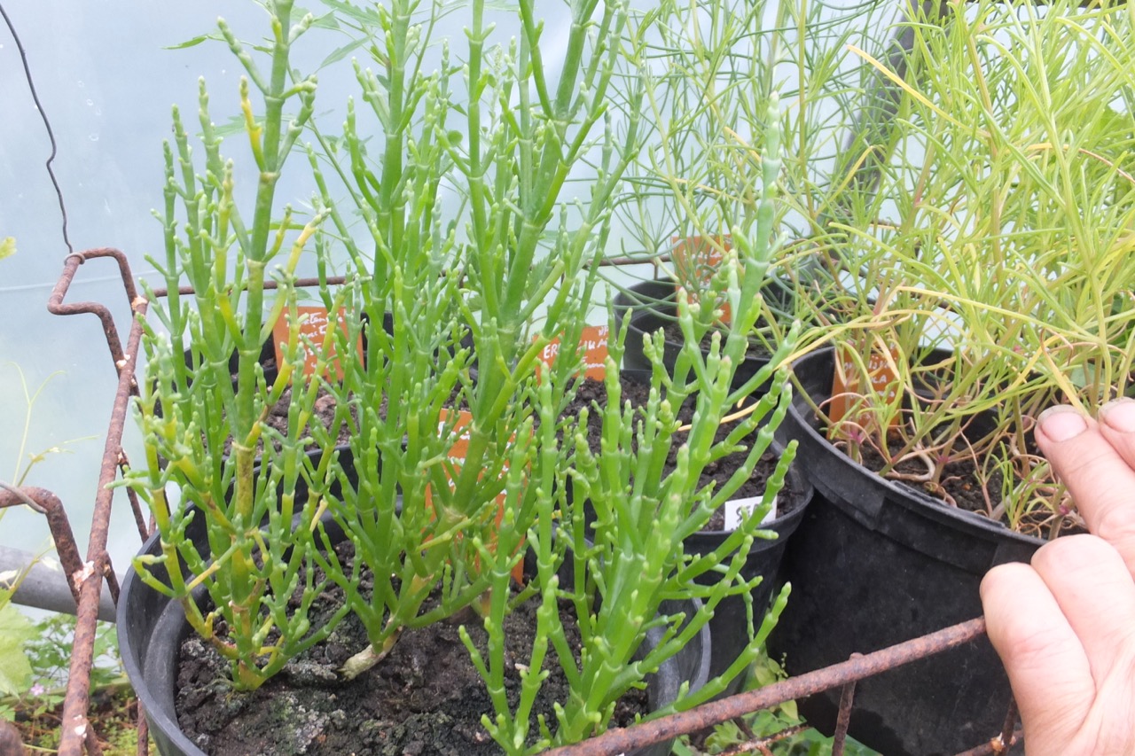 For the edible greenhouse collection this little known maritime esculent is Marsh Samphire, Glasswort, Salicornia europaea. Long collected from shallow salt marshes and sand dunes of East Anglia this is NOT the Samphire, Crithmum maritimum, of Shakespeare, which lives on the wind, blasted rocky outcrops of western coasts. Both living in saline conditions are rich in salts of the many Elements so tasty and nutritiously valuable for us, however this, Marsh Samphire / Glasswort, is by far the easier to cultivate.