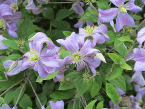 ‘Betty Corning’ has viticella blood, but her frilly, fragrant blue-grey flowers have a touch of warm pink. This American clematis was discovered by Betty Corning, who aas married to the Mayor of Albany. She had spotted this clematis in 1933, in a downtown area, and she took her mother to see it. Mrs Platt realised that it was very unusual and they knocked on the door and the house owner dug up a piece of the plant. Shortly afterwards the house was bulldozed.