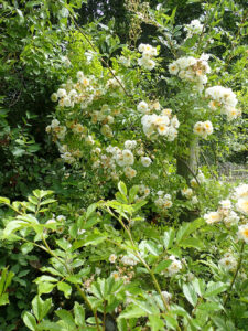 ‘Viticella’ clematis are my personal favourites, because they bear lots of small flowers in July, after the rush of June roses and perennials have faded. Their name means small vine and they scramble very lightly though things. Hence, they make great follow up acts with rambling roses, which generally flower once in June. The combination of the apricot rambling rose ‘Goldfinch’ and the deep-purple ‘Etoile Violette’ works really well and they overlap slightly in most years. The dark-purple flowers usually have six tepals, each separated by a wide gap, surrounding cream-yellow stamens.