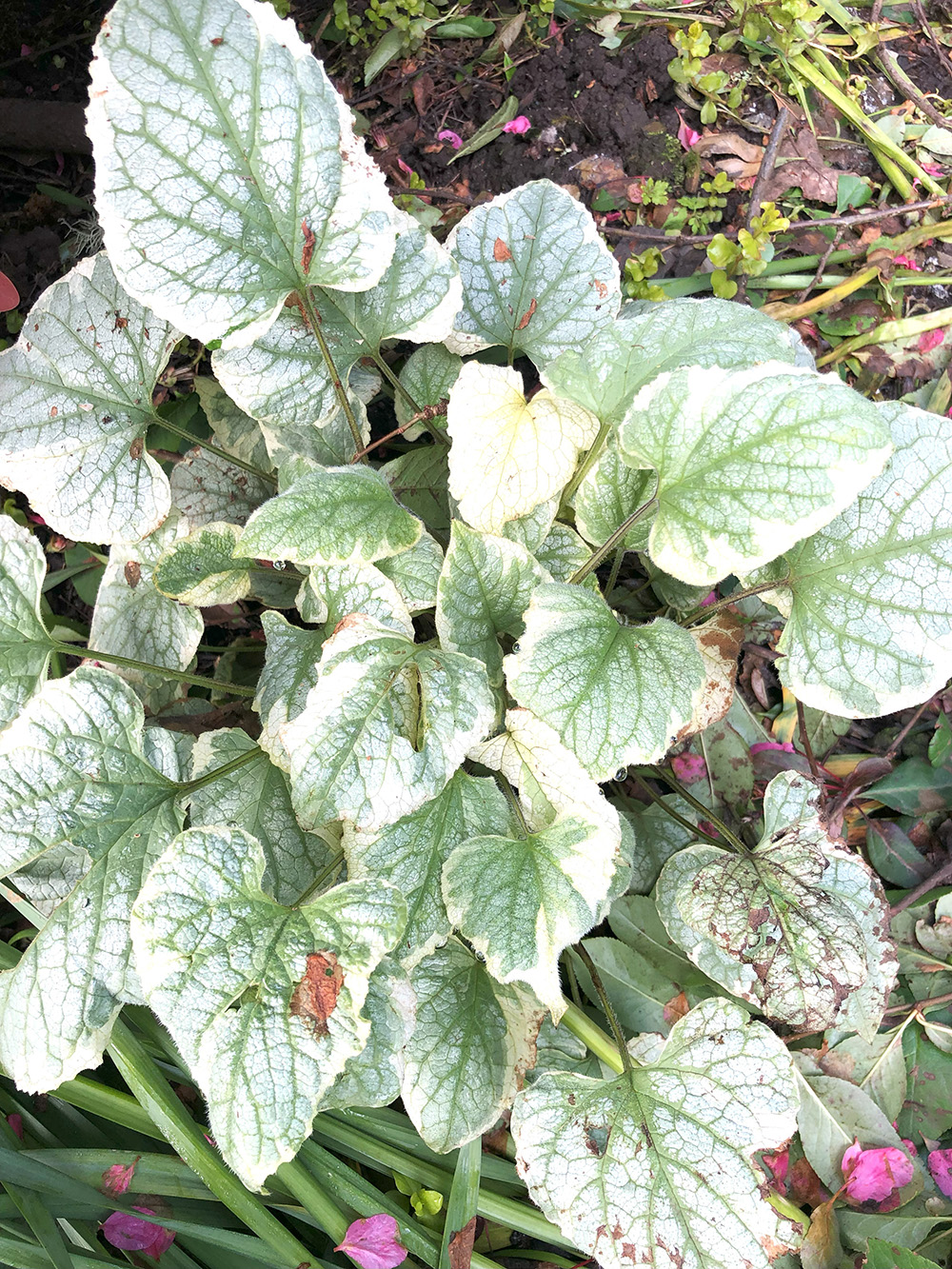 Brunnera cvs.– Many cultivars are out there, such as ‘Alexander’s Great’ and Silver Heart’. All have various shades of pale gray to white foliage about a foot tall and 30 inches wide, although some can occupy more space. Grows in shade to part shade in Zones 4-9. The leaves are thick and tough so it makes a great substitute for snail-holed hostas.