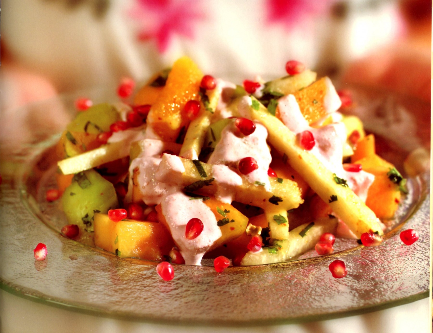 For 4 people, peel and cut 2 navel oranges into bite size pieces. Similarly prepare 2 cups of honeydew melon, or watermelon. Slice a small jicama – or for more flavor, a celeriac root – into matchsticks. Toss in a bowl with half a cup of pomegranate seeds and a couple of tablespoons of chopped coriander leaves. Extract the juice from a half cup of pomegranate seeds by squeezing through a sieve, then add the juice of half a lime. Mix into the fruit. Sprinkle with salt and black pepper and set aside for one hour minimum to let the flavors meld. Dust with a pinch or two of chili powder before serving. A dribble of crema (sour cream) is optional.
