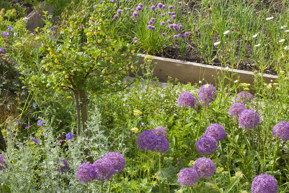 There’s one plant I really look forward to in May and that’s the tall, statuesque allium, because they provide strong verticals, round or drumstick heads and vibrant colour. They’re versatile too, because these tall early-summer alliums look equally at home in the vegetable garden, or the flower border, and you can create your own river of colour. Mine flow up the front path close to standard gooseberries and the combination of pale-green fruit and purple domes sums up early summer.