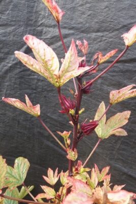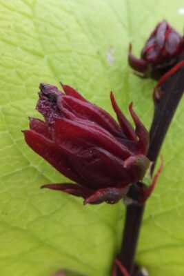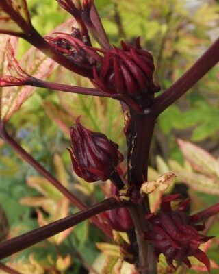 You grow this annual from seed starting early in the year, in warmth much like tomatoes, potting up and growing on likewise under cover till finally planting into large tubs. It likes warmth and humus rich compost, will tolerate drying out but not waterlogging and isn’t prone to many problems. Depending on variety Roselle makes a small bush a metre or two high and less across so seldom needs staking. Once the calyces are ripe, plump and succulent then use immediately say in a tea or pick and dry for later.