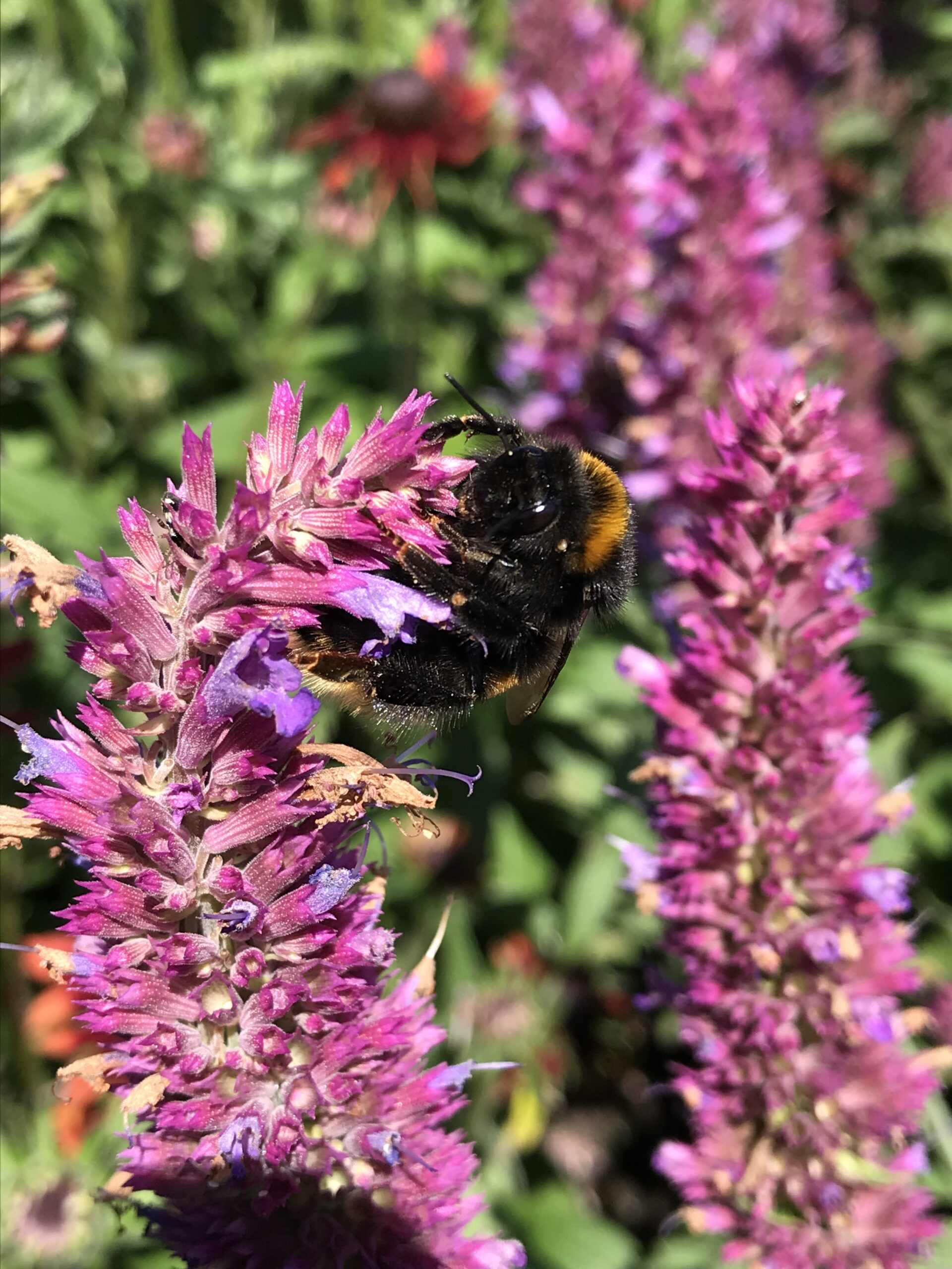 For the last few weeks, the peace of the garden has been enhanced by a deep buzzing sound as the queen bumblebees that have survived the ravages of winter, predators, disease and even gardeners brandishing their trowels and forks in the garden soil start to emerge. Bumblebees overwinter as a mated queen. They hatch in the previous summer within a bumblebee colony and emerge a week or so after the males. Their first job is to find a mate, hopefully a male from a different nest so that they can enhance the genetic diversity of their babies. Once mated the queen bumblebees need to feed up fast and this is when you will find the huge, freshly hatched and perfect queen bumblebees feeding on your nectar rich flowers in summer. They spend a few weeks feeding on agastache, verbena, echinops and other summer flowers. Then they find a safe hidey hole to overwinter, staying in a kind of suspended animation for 6 or 7 months. Often, they choose a north facing bank where the winter sun won’t wake them. And then as spring starts, species by species they start to emerge and build a nest.