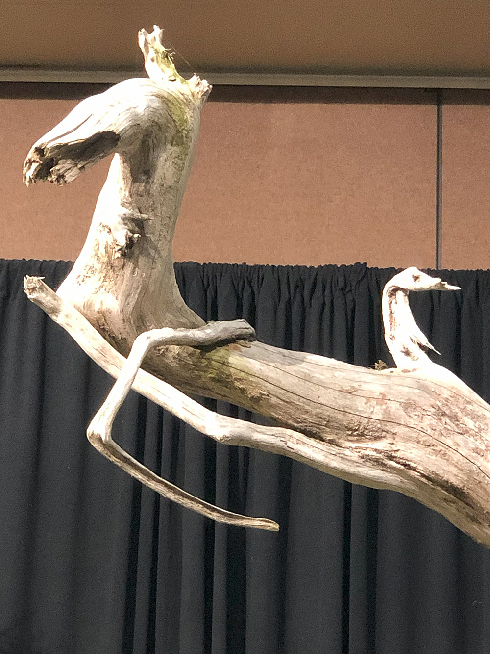 For instance, on the show floor this year, the golden color of found objects in nature was evident. Elandan Gardens had a large piece of twisted driftwood, reminding many of a unicorn, leaping high above the display. And Nature Perfect Landscape had an entire moon gate made of sun-bleached driftwood, enticing viewers to peer through into a waterfall world. So, go ahead, mix the subtle colors with lush foliage indoors for a look that is both timely and celebrates the seasons.