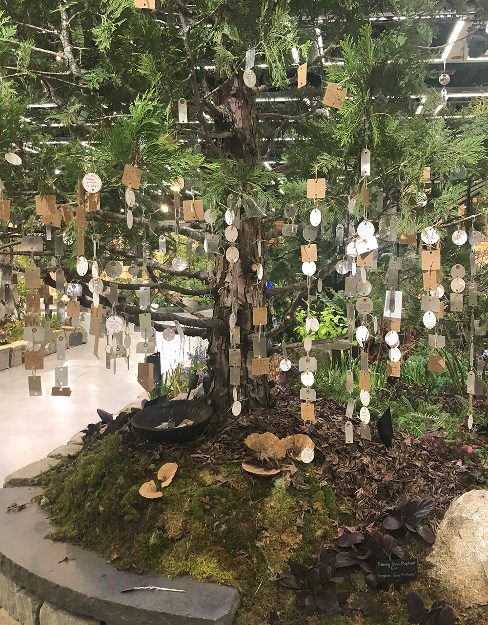 Leaf litter—good for overwintering insects—is not often spotted at an indoor show, but Jessie Bloom’s Northwest Bloom used it to good effect under a massive cedar. Showgoers were invited to hang wishes on its branches. And nestled among the leaves at the base were various ocher fungi. The effect was a nature surprise waiting half-hidden under the tree.