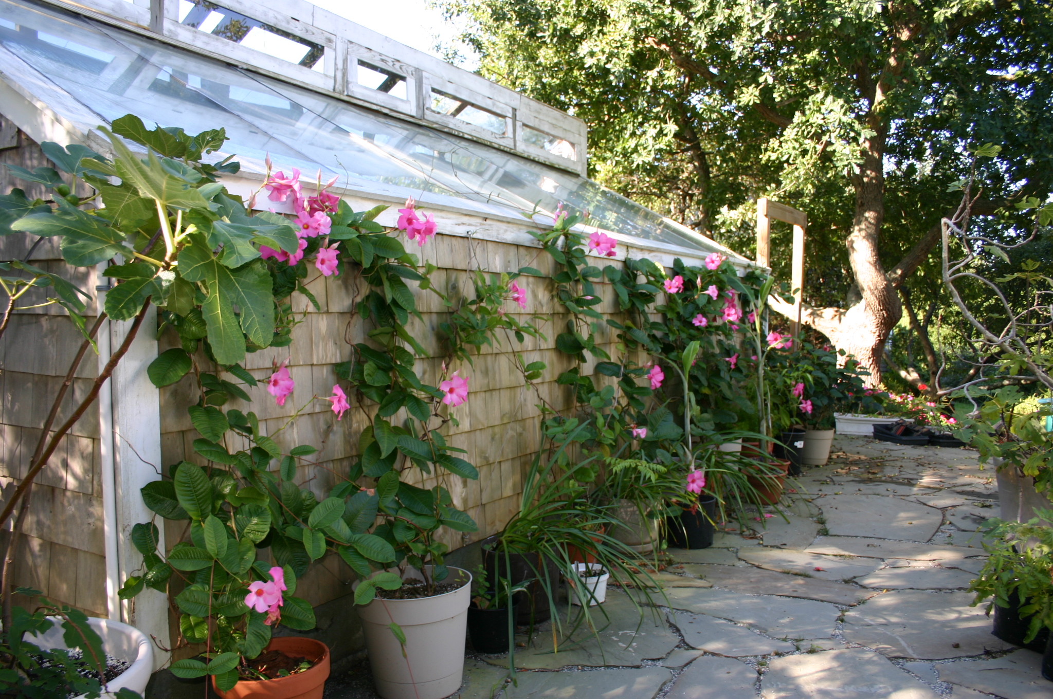 Not long after my first raised beds were constructed, I built a wood-framed 10’ x 30’ heated greenhouse abutting my design studio. Although at first this greenhouse seemed far larger than I needed, there’s now barely space for even one more plant. During winter, I initially used a propane heater in this greenhouse, but the constant sight of it glowing on cold winter nights made me fear I might burn my studio down. So I eventually switched to an electric heating system. It’s more expensive to use but offers greater peace of mind! This heated greenhouse allows me to grow citrus trees, orchids, mandevilla, agapanthus, avocado, and other tropical and semi-tropical plants in a climate where winter temperatures can drop far below freezing.