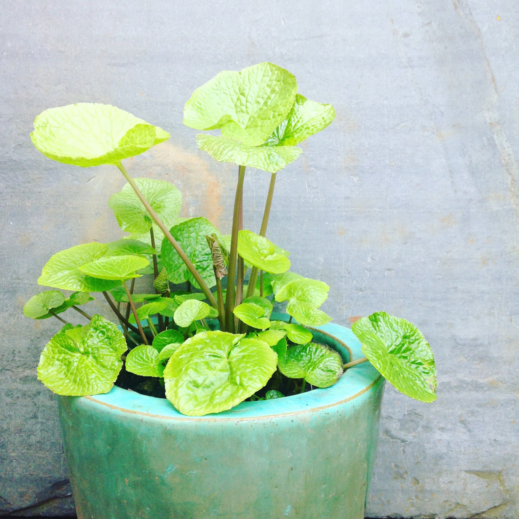 The greenhouse is now playing host to all of those plants that need a bit of protection over the winter, cheek by jowl. Wasabi is not one that needs it, and yet I have found a corner for it anyway. I have been growing wasabi – the stuff that you dab delicately onto sushi and that feels like you’ve snorted chilli powder if you overdo it – for a few years now. It is the finely grated root that you will find alongside your sushi, or rather it often isn’t, as the real stuff is replaced with cheaper horseradish and given a blast of green colouring in lots of cases in order to keep costs down, and this is why it is not a bad idea to grow your own and get the full wasabi experience. But my sushi habits are fairly low key, and as such I find I don’t have such a huge need for wasabi root that it really warrants digging up an entire plant to grate its root. The leaves however are a different matter, and I am slightly addicted. They are soft and round but most importantly they contain all of the flavour of wasabi but with none of the nasal hair-scorching heat, a lovely and mild but weird and interesting addition to a salad.