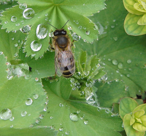 Have you ever noticed the droplets of water on the leaves of lady’s mantle (Alchemilla mollis)? Water accumulates on the fuzzy leaves, providing drinking spots for insects and garden wildlife. The morning dew accumulates on the grass underfoot and adds moisture to the surface of the soil. Stop and look, it’s a beautiful sight. After rain look for water droplets on the flowers, on the moss and on the trees; each one is a tiny little mirror in the garden, capturing small snapshots of garden life. As the water falls to the ground it is absorbed by the soil and held there until it is taken up by the plant roots.
