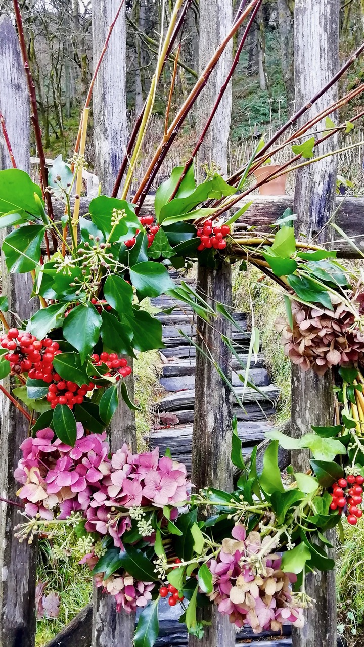 I’ll also amass a trove of seasonal decorations that you’ll not find in the shops: berries such as holly (if I can beat the blackbirds and fieldfares to it) or hawthorn, dog rose hips, storm-downed lichens from the wood, pine and spruce cones, ivy (glossy shoots and any dangling, liana-like stems), bilberry shoots (they have sinuosity to die for) and other evergreen foliage, faded hydrangea mops, teasels, any seed heads and pods, and if you can bear to snip them, fresh winter flowers such as mahonia for their exquisite scent. In fact, you can use anything from your garden (or anyone else’s, with their blessing), that catches your eye as a recruit to your mind-mending plan.
