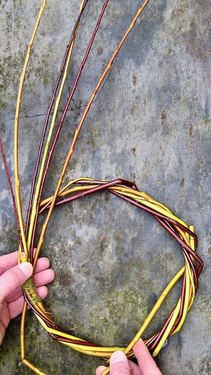 To begin, we need a good bundle of fresh and pliable shoots up to 1.5m (5ft) long, with an exemplary degree of sinuousness – dead or rigid and brittle shoots won’t help us weave our way to calm. My go-to stems come from the colourful-barked willows I planted many moons ago. These provide a winter harvest of whippy shoots that can easily be bent into a circle of a diameter of your choosing – the product of this therapy session is destined to look magnificent on a gate, wall or door, so bear that in mind when deciding on the size. I might also include some long and flexible hazel, silver birch, wild willow, dogwood or vigorous young larch shoots – whatever my unwinding wanderings proffer.