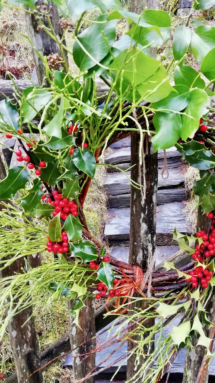 Don’t rush. Bedeck a bit, then stand back. Hold the swirl where you fancy it’s going to look good (you’ll want to show it off). Switch your winter treasures around, group colours together, or try contrasts. Be as arty-farty as you want. Simple might be best – too fussy can become blobby. Play around.