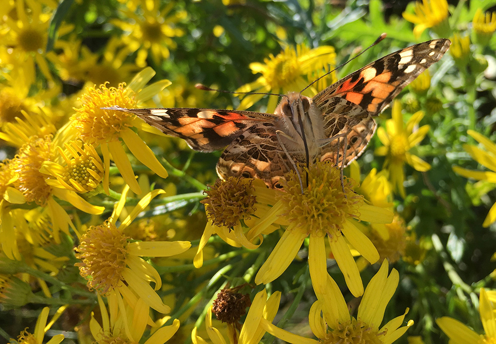 Ragwort is a really, really bad plant. Or so we are led to believe. But what if I told you that at least thirty insect species rely entirely on this plant for their survival and that ten of those are rare? It’s a food plant for 75 species of insects. Not only that but over a hundred of our precious pollinator species feed on the rich nectar that the ragwort flowers produce. Without ragwort dozens of species of insects would cease to exist. Virtually all the tiger moth caterpillars eat it. The cinnabar moth, which actually naturally controls ragwort, is dependent on it. The cinnabar moth is totally dependent on just this plant and that makes it fascinating. It feeds as a caterpillar on the toxic flowers and foliage of the ragwort plant. The toxins, types of heart stopping alkaloids, are taken into the body of the caterpillar making them poisonous to eat. They make no secret of this as they sport one of the most dramatic warning-dress of their kind, bright orange and deep black stripes screaming danger and stop. And the toxins are also present in the equally dramatic looking adult moths. Its blood red underwings and red spotted and striped, black forewings have a distinct Dracula appearance and again ward off predators. Of course, it is a danger to livestock if eaten fresh in the field, but it tastes really horrible and most herbivores avoid it, unless there is nothing else to eat. The biggest problem is when the meadow is cut and the dried hay or silage contains ragwort, then it becomes more difficult to detect and will poison livestock if it is fed to them. But away from horses and livestock the presence of ragwort is considered to be important as a nectar source for pollinators and a host plant for a number of rare invertebrates that cannot feed on anything else. It is also a native UK plant and where it grows on uncultivated land and is doing no harm, could, perhaps, be allowed to grow