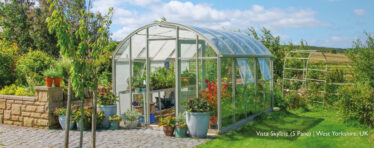 The Vista Greenhouse is a modern small Greenhouse that combines straight lines and sweeping curves.