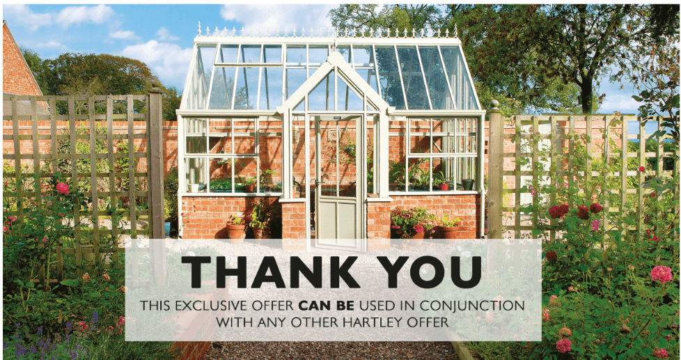 As promised, here is your exclusive code ‘THANKS-2018’ to receive £100 of FREE accessories, when you purchase your Hartley glasshouse.